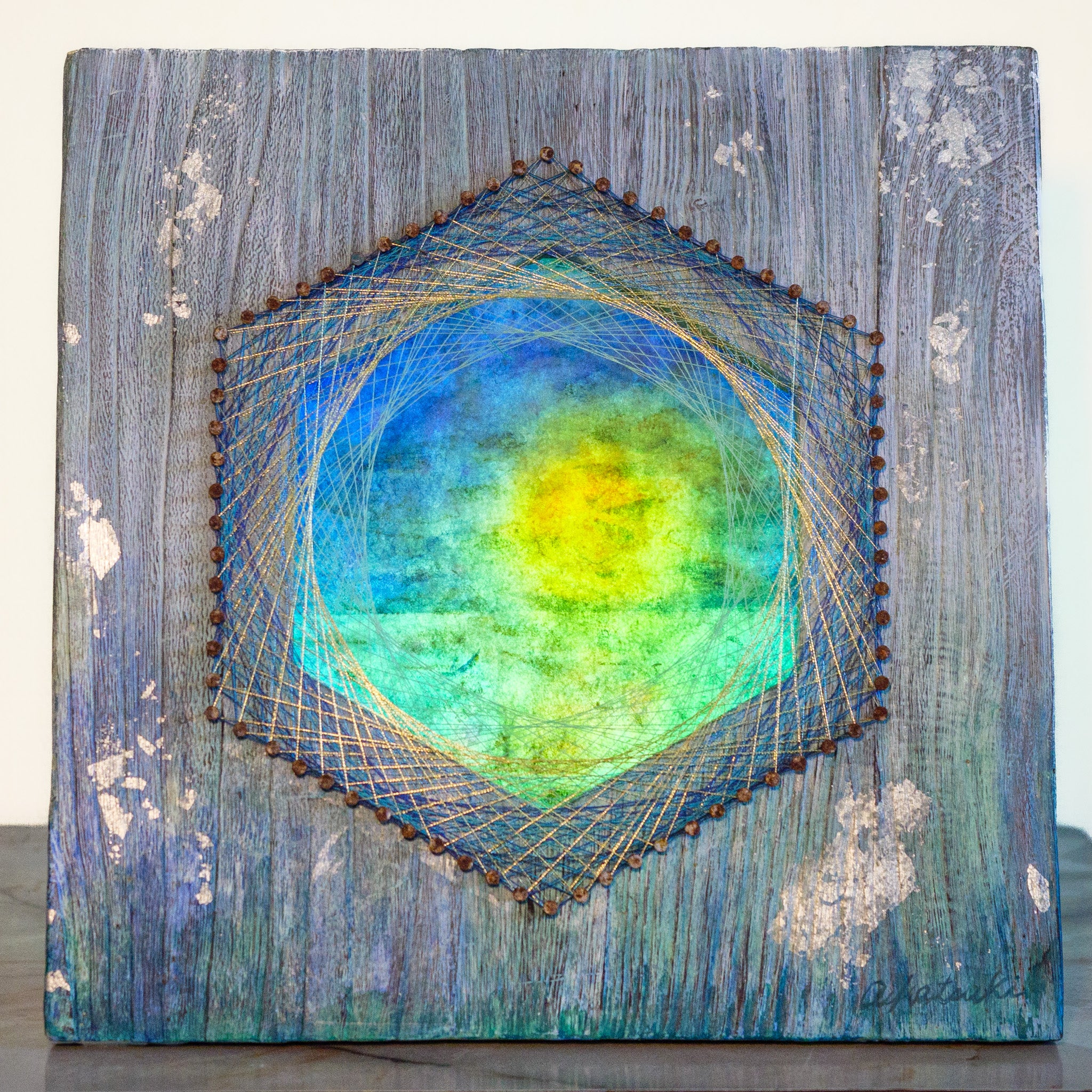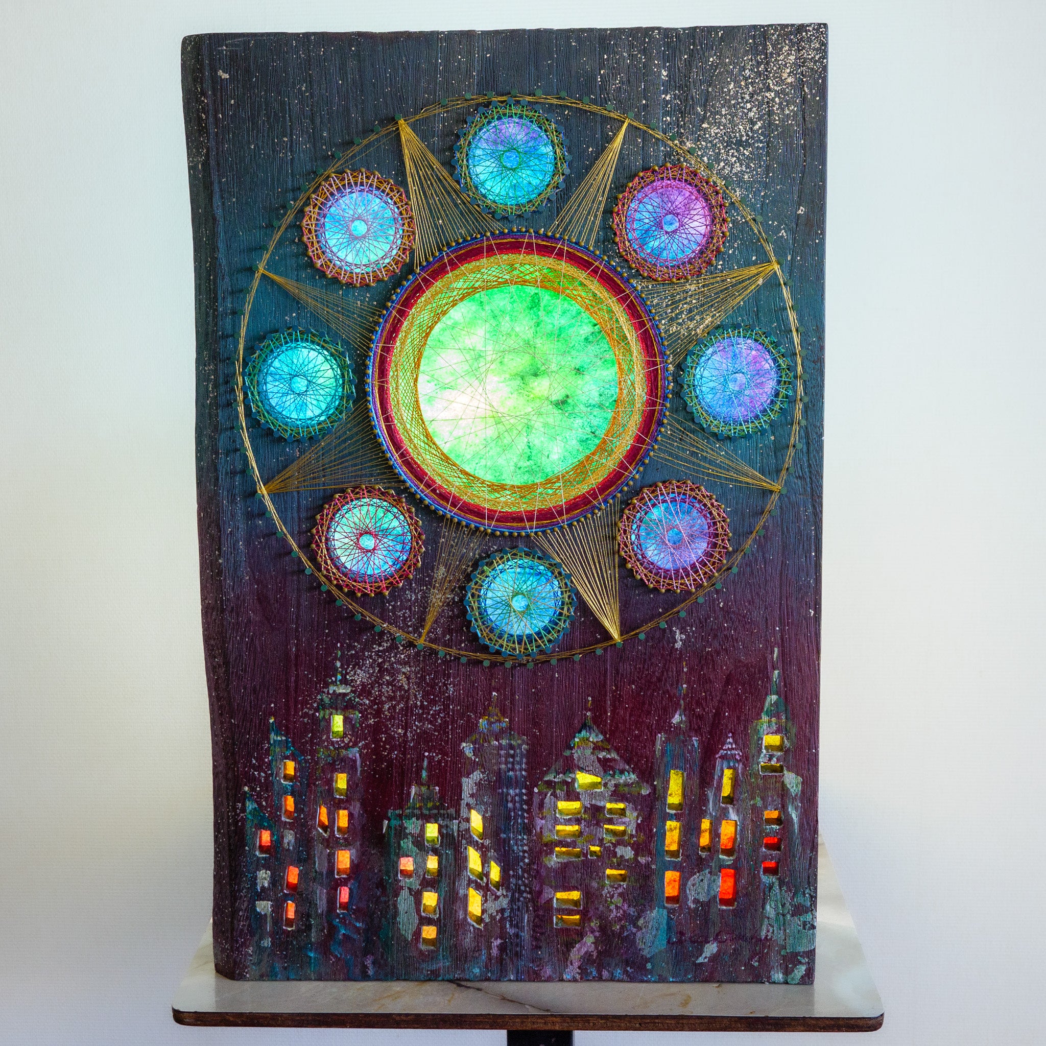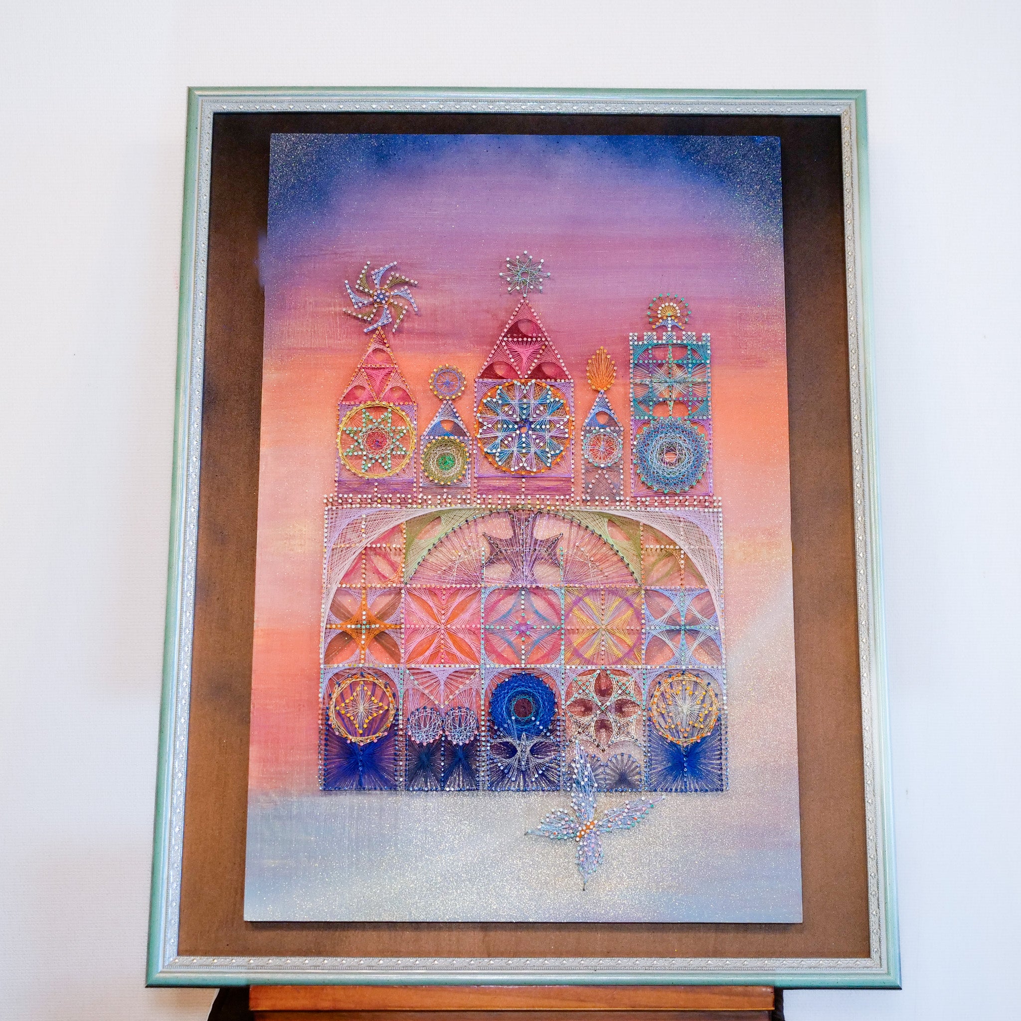 String art is expressed in exquisite multi-layers on a base with multicolored nails colored by the artist himself on a background expressing the gradations of Twilight.