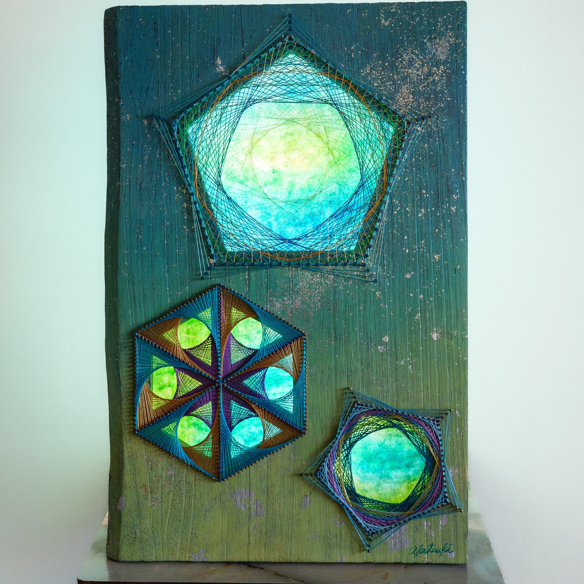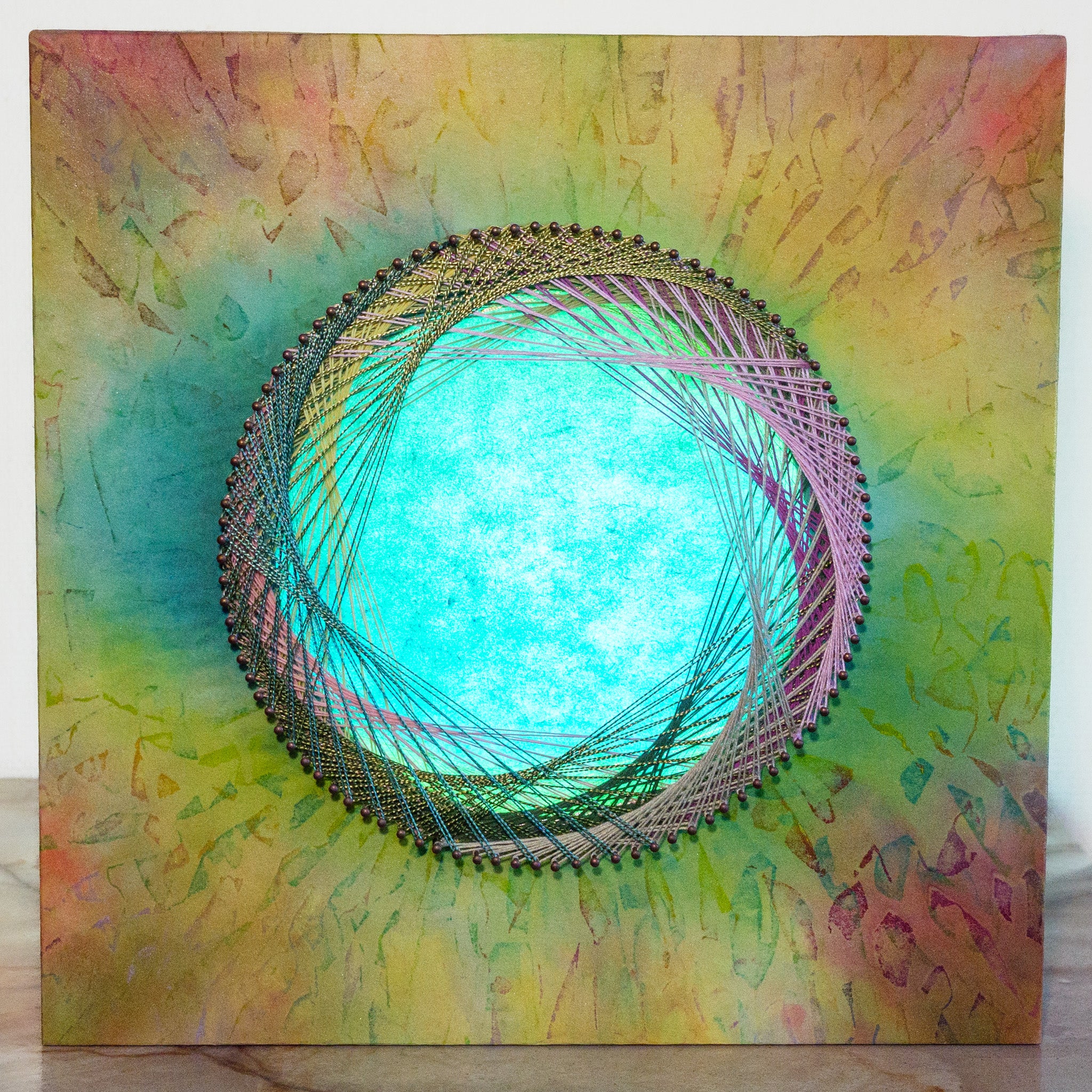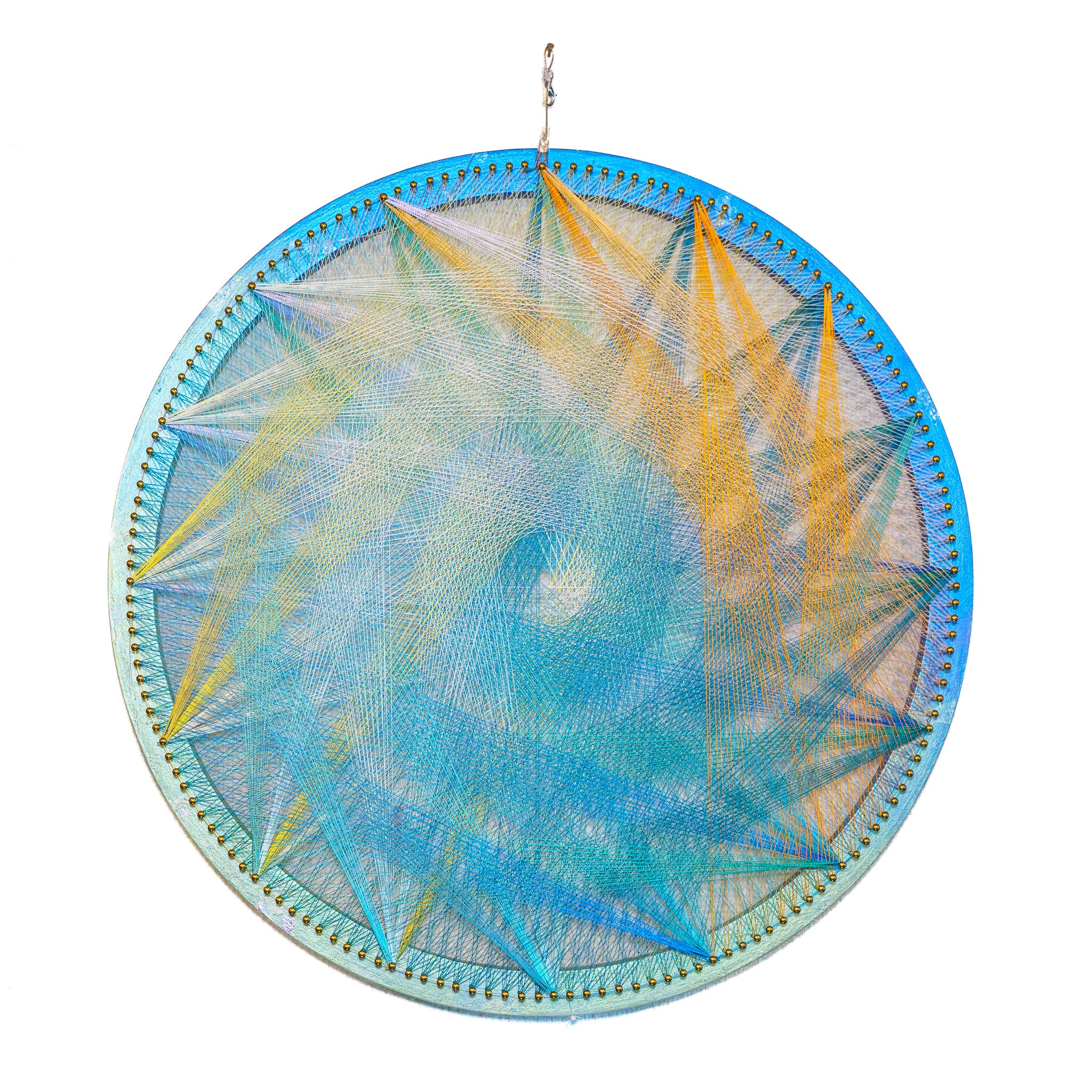 String art is expressed in exquisite multi-layers on a base with multicolored nails colored by the artist himself on a background expressing the gradations of Twilight.