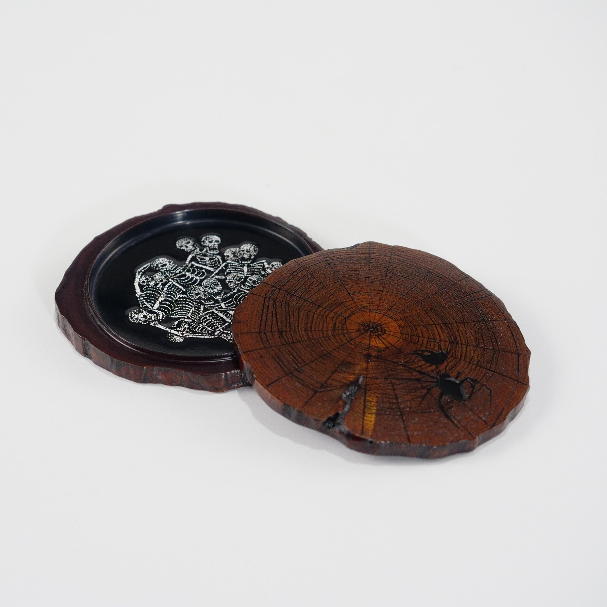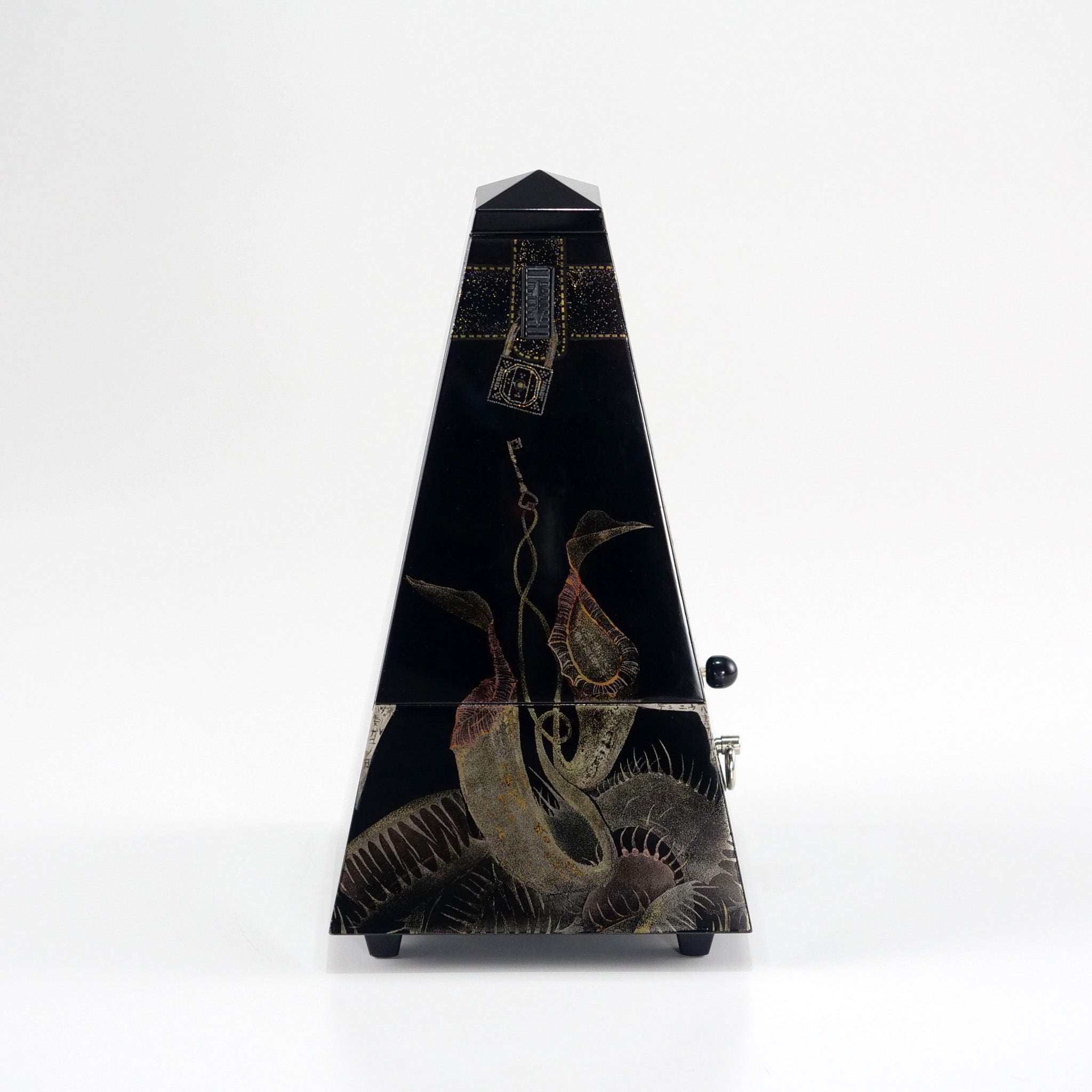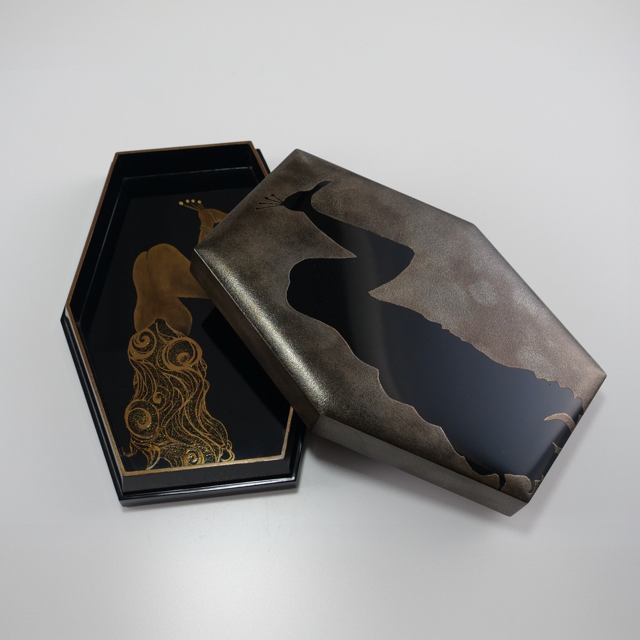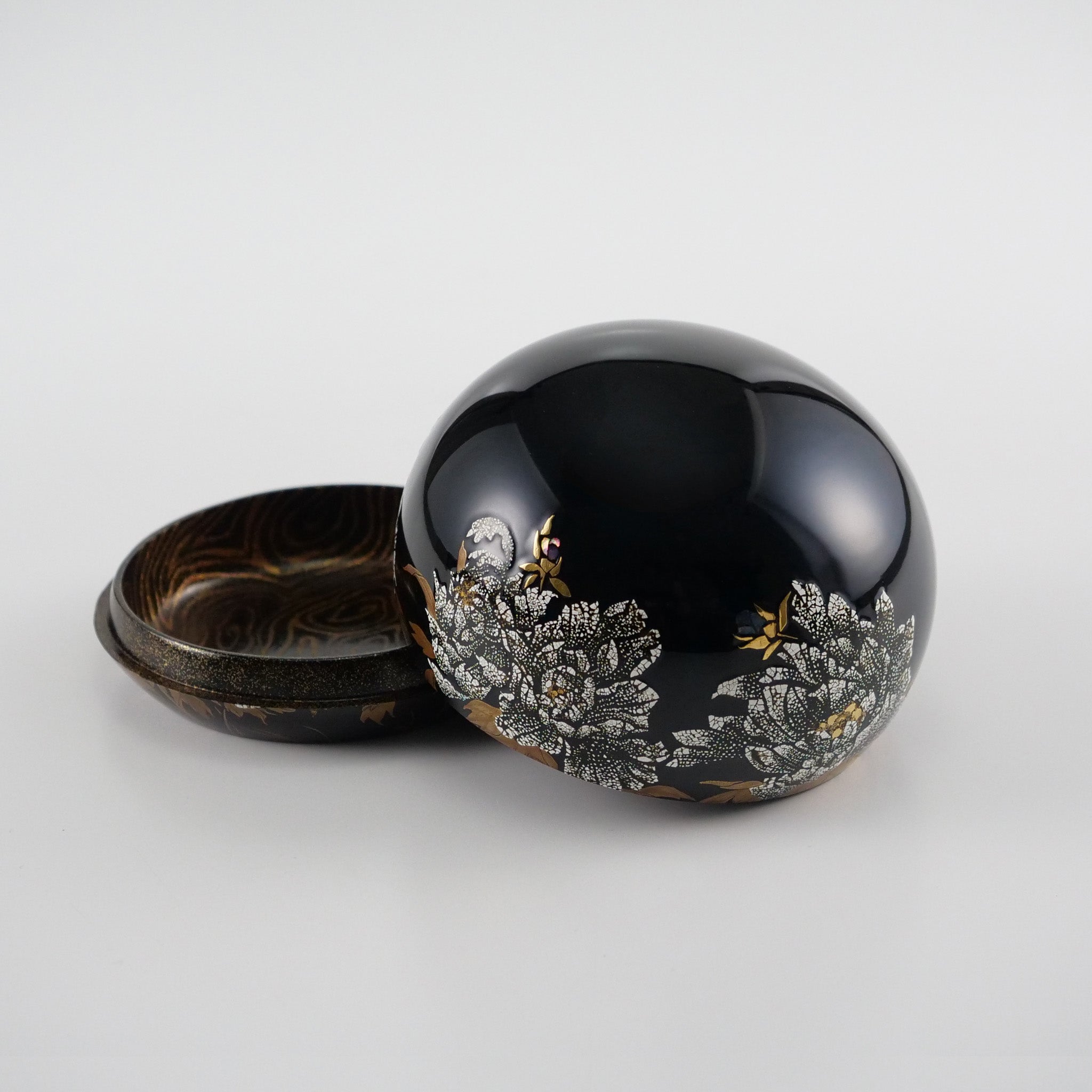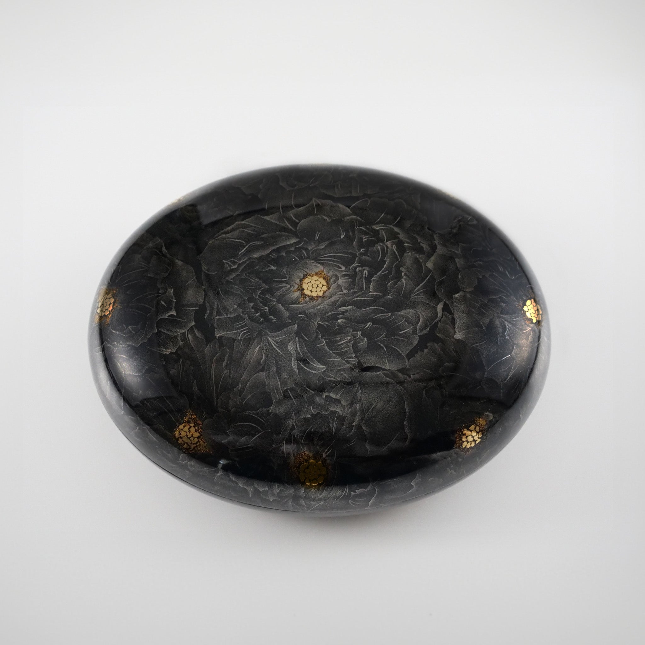 "The Mermaid's Lament" is a story set in Nanjing during the Qing Dynasty, as imagined by Tanizaki. The decorations on the exterior of the box recreate the opening scene of the story, "The Aisin-Gioro Dynasty flourished and shone like the peonies in June." This piece doesn't capture the brilliance of the peonies at their peak but instead represents, through maki-e, the peonies that struggle to bloom in their final moments. I want to explore the differences in interpretation between the reader and the artisan. The flowing water motif inside the box is depicted in dark maki-e, while the peonies on the outside have an expression of decay. The scenery hidden behind the novel's descriptions is reinterpreted through maki-e.