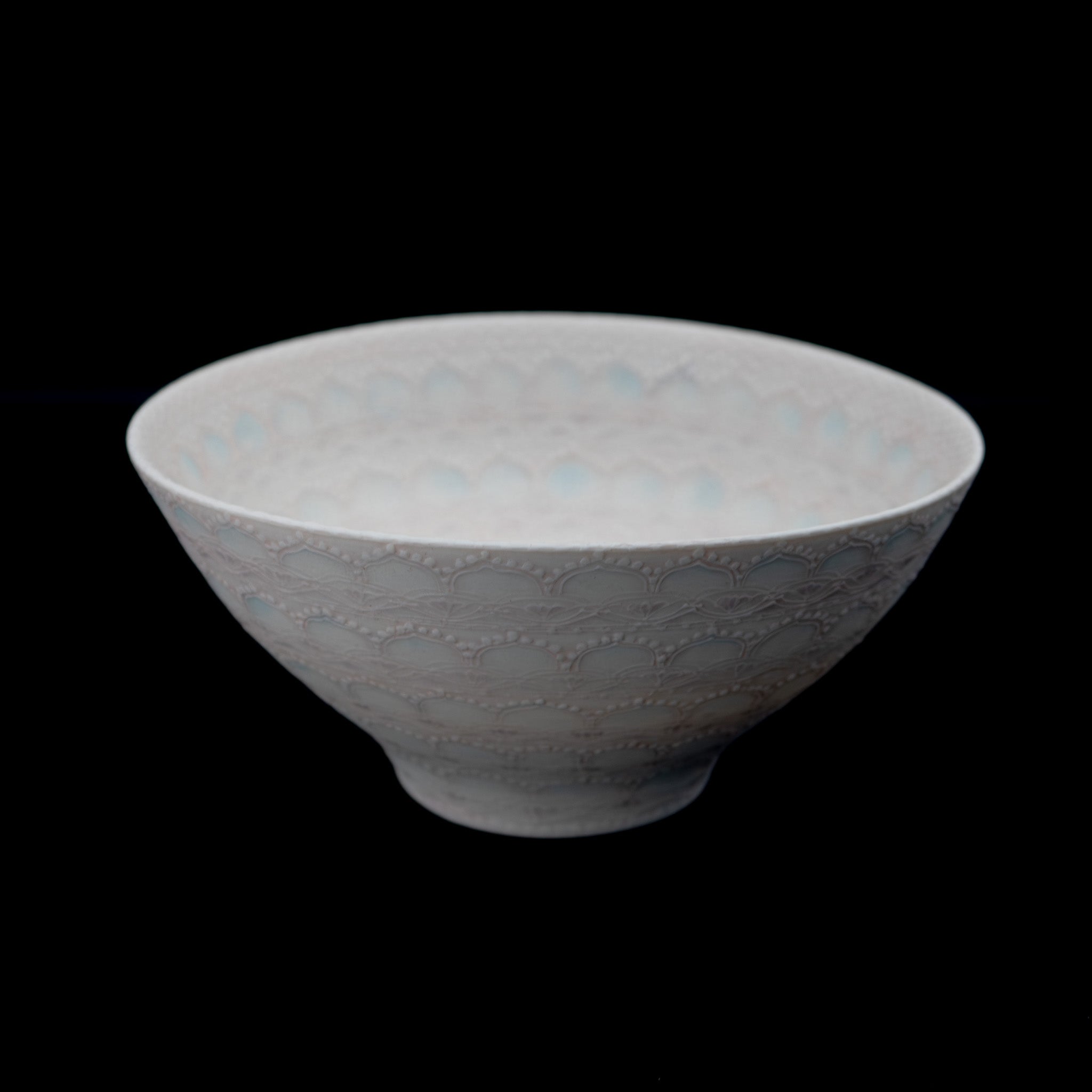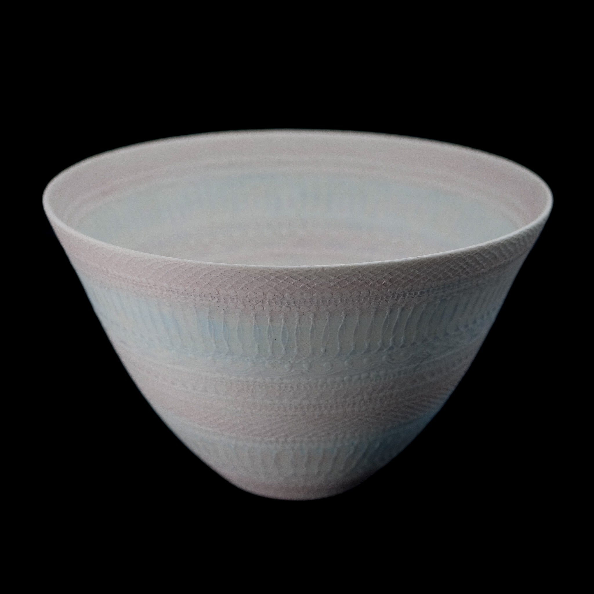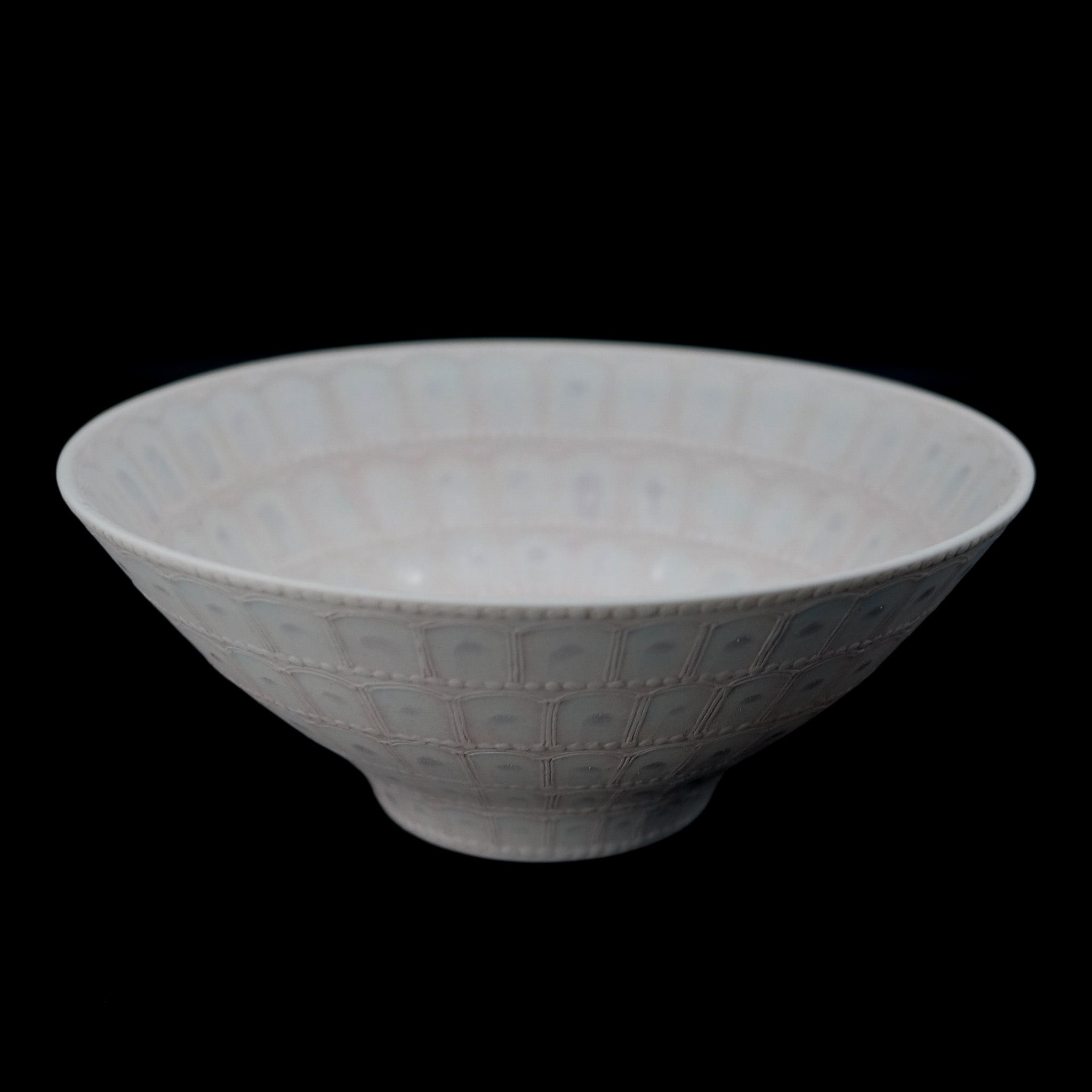 The piece is made from porcelain clay shaped on a potter's wheel and decorated using the Icchin technique (a slip-trailing method). After applying colors, it is glazed and fired. Finally, an overglaze decoration is applied and fired again for the finishing touch.