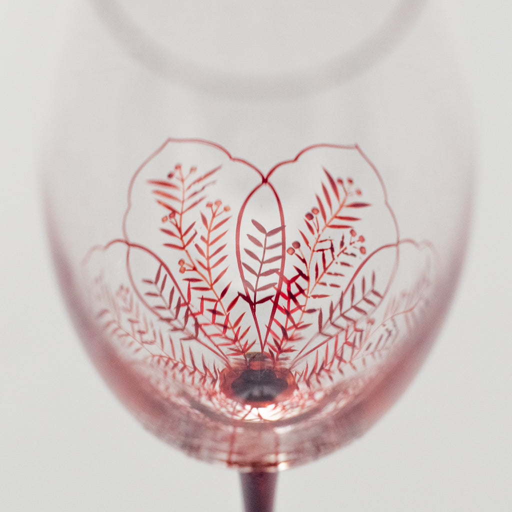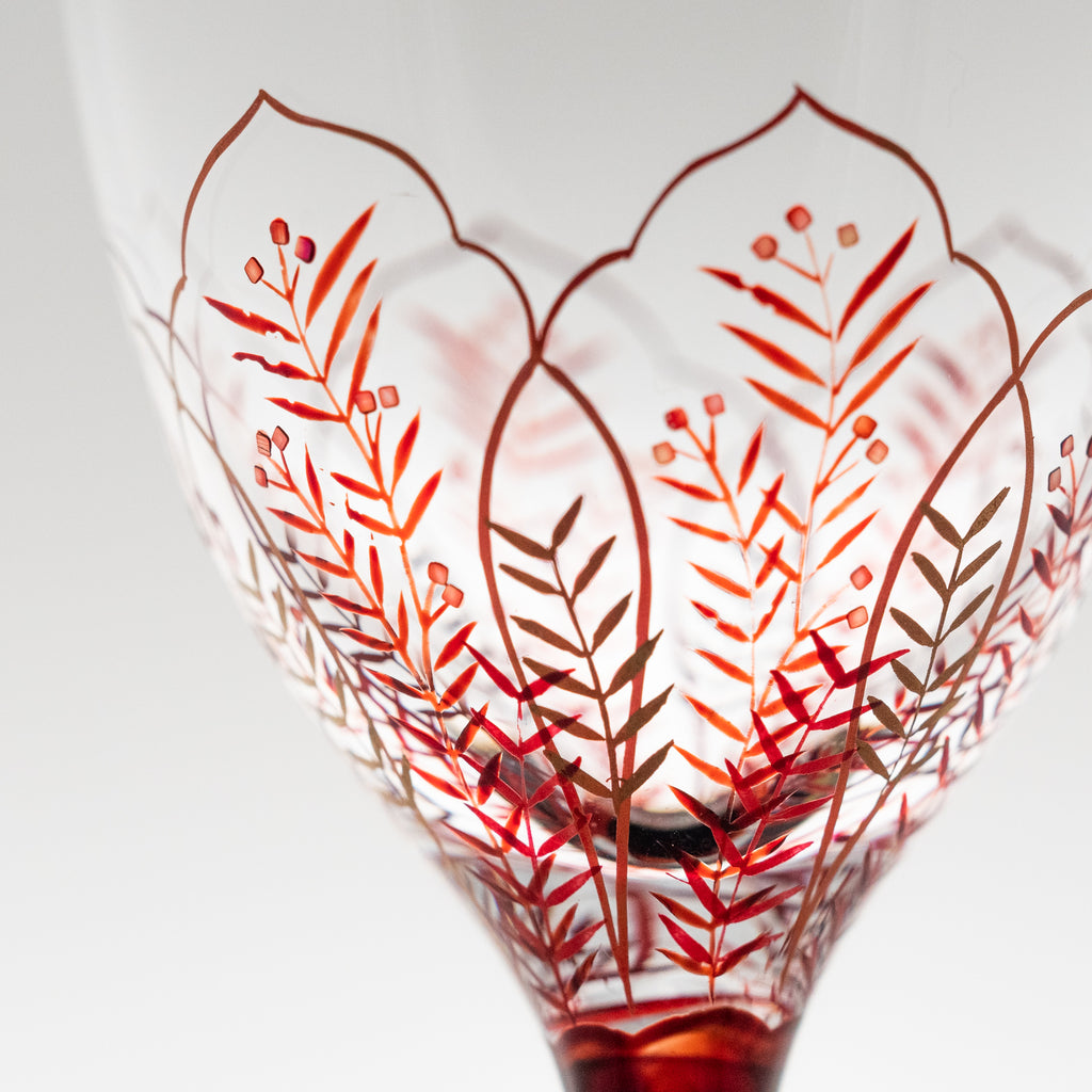 You may consider using this wine glass adorned with vibrant red flowers resembling a blooming blossom, named "Garden,"at garden parties or similar gatherings.