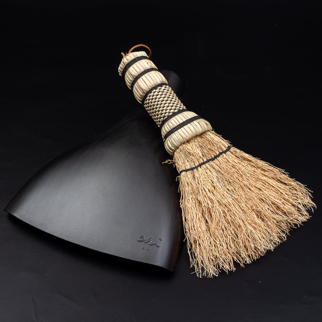 My latest work: the chiritori x houki 2.0 is carved meticulously with each piece by hand. It is made using "Eco-Urethane," natural indigo dye from Tokushima, and the wiping lacquer technique used in Yamanaka lacquerware. The broom, on the other hand, is a one-of-a-kind creation, crafted with self-cultivated broomcorn and honed with years of experience and dedication.